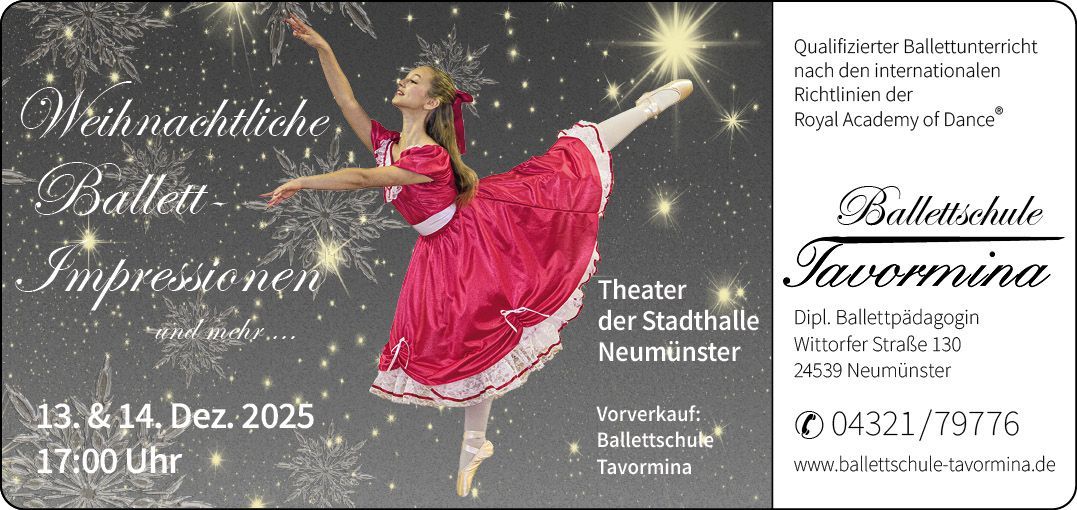 Am 13. und 14. Dezember 2025 ist es endlich wieder soweit: Die Ballettschule Tavormina präsentiert sich auf der großen Bühne. In der Stadthalle Neumünster erwarten die Besucher und Besucherinnen "Weihnachtliche Impressionen und mehr...".